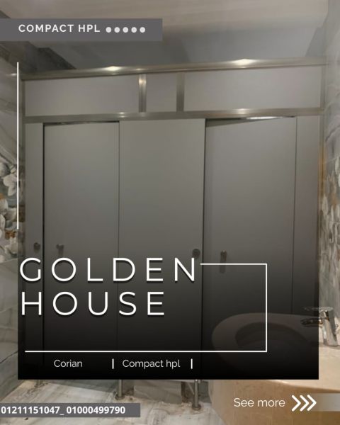شركة جولدن لتركيب أبواب الكومباكت وتركيب قواطع حمامات أل HPL Compact والكوريان الرخام الصناعي بجميع الالوان وتركيب فواصل حمامات HPL وأبواب حمامات HPL كومباكت تحت اشراف متخصصون على أعلى مستوى على لشان كده بنقدم لك ضمان 3 سنوات حصري بشهادة معتمده من الشركة أسعار تنافسيه مش عند أي حد المعاينة ورفع المقاسات مجانيه. سرعة في التنفيذ دقة في المواعيد جميع الالوان متوفره من الصيني والهندي. جميع الأكسسوار من