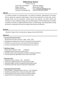 عبدالرحمن أحمد، 25 سنة، حاصل على بكالوريوس تربية، لدي خبرة عملية لمدة سنة في مجال المحاسبة والداتا انتري داخل الدولة. أتميز بالدقة والالتزام وسرعة التعلم، وأجيد استخدام الكمبيوتر والبرامج المكتبية. متوفر لدي رخصة قيادة واقامة قابلة للإعارة، وابحث عن فرصة عمل مناسبة أستطيع من خلالها تطوير مهاراتي والمساهمة بفاعلية في العمل وجاهز للعمل فورا والانتقال لأي مكان