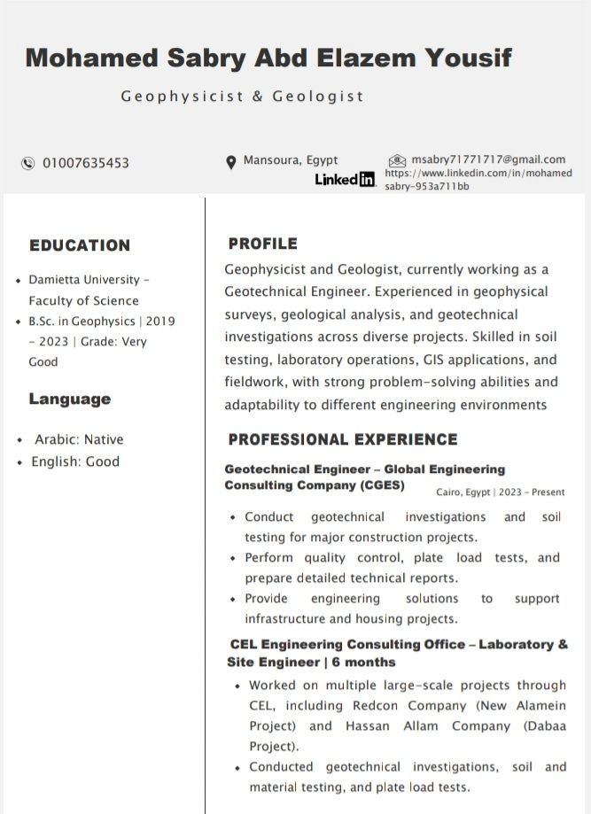 أريد وظيفة في مجال الجيولوجيا أو الجيوفيزيا أنا خريج 2023 بتقدير جيد جدا أنا عندي خبرة في مجال التربة والخرسانة والطرق اشتغلت في مكاتب في القاهرة استشاري جودة طرق وخرسانة واشتغلت مهندس جودة خرسانة في محطة خرسانة وملم بكل اختبارات التربة والخرسانة وجودة الخرسانة وحاليا بعمل دراسات عليا في مجال الخرسانة وأنا طموح جدا شكرا جزيلا لكل من يرى الاعلان