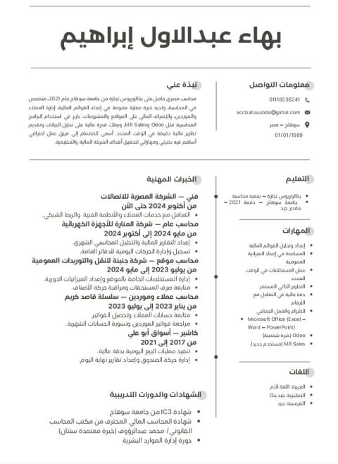 A professional accountant is seeking a job opportunity. I have 8 years of experience in financial management, auditing, and report preparation using Odoo and QuickBooks systems. I have a proven track record of improving financial efficiency, reducing costs, and enhancing cash flow. I am distinguished by accuracy, organization, and teamwork. I am ready to contribute to the success of your organization.
