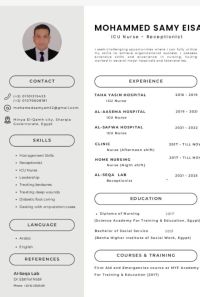 تمريض خاص بخبرة 10 سنوات في المستشفيات والعيادات الخارجية والتمريض المنزلي، مع خبرة في العناية المركزة والطوارئ والعناية بالجروح العميقة