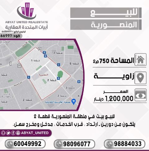 For sale: A house in Al-Mansouriya area, Plot 2. Location: corner, Area: 750 square meters, consisting of two floors, setback, near services, easy access and exit. For inquiries: Mobile 1, Mobile 2, Mobile 3. Price: 1,200,000 dinars. Code: 66997.