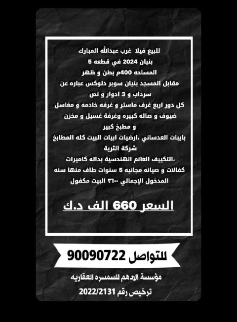 For sale in the South Abdullah Al-Mubarak Al-Sabah area. Corner location with two street fronts. Area: 400 square meters, Plot 6. Three and a quarter floors. Easy entrance and exit. New, first occupant. Ground floor: diwaniya (reception area), majlis (sitting area) with utilities, two halls, kitchen. First floor: 6 master bedrooms, hall, and kitchen. Second floor: two apartments, each with three bedrooms (one master and two with a shared bathroom), hall, kitchen, and maid's room. Quarter floor: domestic worker's room, laundry room. Super deluxe finishing. Price today: 540,000 KWD. For inquiries, contact Al-Mukhtar Real Estate Company, Abu Muhammad.