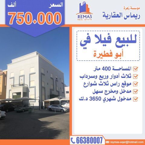 For sale A villa in Abu Fatira consisting of three and a half floors and a basement, located in an excellent location with front and rear entrances, generating a monthly income of 3850 Kuwaiti dinars, with an area of 400 SQM