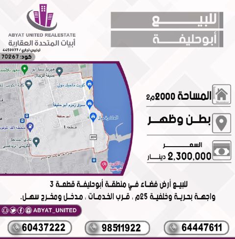 للبيع: أرض فضاء في منطقة أبو حليفة، قطعة 3. الموقع: بطن وظهر. المساحة: 2000 متر مربع. واجهة بحرية وخلفية بعرض 25 مترًا. مدخل ومخرج سهل. قرب الخدمات. للاستفسار، النقال رقم 1، النقال رقم 2، النقال رقم 3. السعر: 2,300,000 دينار. الكود: 70267.