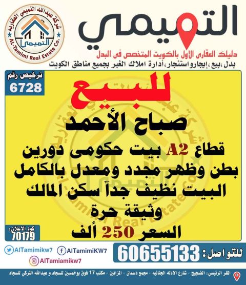 للبيع: بيت مجدد بالكامل في صباح الأحمد مع تكييف مركزي. الوثيقة حرة وشهادة الأوصاف جاهزة. المساحة 600 متر مربع. الموقع بطن وظهر على طريق رئيسي. المالك ساكن. سعر البيع 250 ألف دينار كويتي.