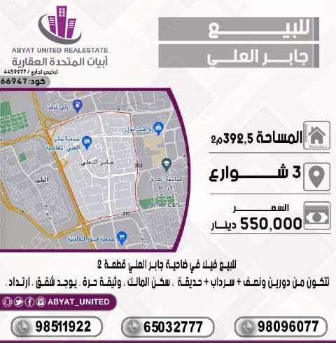 للبيع فيلا في ضاحية جابر العلي قطعة 2 الموقع، 3 شوارع، المساحة 392.5 م² تتكون من دورين ونصف، سرداب، حديقة، سكن المالك، وثيقة حرة، يوجد شقق، ارتداد. للاستفسار النقال 1 النقال 2 النقال 3 السعر 550 ألف دينار الكود 66947