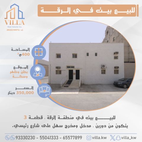 للبيع بيت في منطقة الرقة، قطعة 3، المساحة 400 متر مربع. الموقع بطن وظهر وسكة، يتكون من دورين، مدخل ومخرج سهل على شارع رئيسي. السعر 350,000 دينار كويتي. للاستفسار، اتصل على نقال 1، نقال 2، نقال 3.