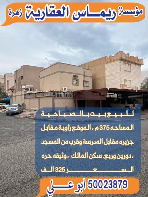 For sale: A villa in the Aqila area, with an area of 375 square meters, located on a single street, consisting of two units, with central air conditioning. The villa is very clean, owned by the resident, easy to access, close to services, and has easy entry and exit. Price: 380,000. The ground floor contains an external diwaniya and courtyard, a diwaniya with a bathroom and sinks, a hall with a bathroom and sinks, two rooms, a kitchen, and a maid's room. The first floor contains three master bedrooms, a hall, and a kitchen.