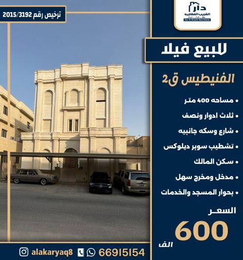 For sale: A villa in Fintas, Area 2, with an area of 400 square meters, three and a half floors, on a street and a side road, super deluxe, owner-occupied, with easy access and exit, near the mosque. Price: 600,000 KWD.