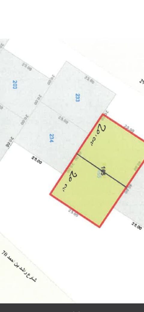 For sale, a vacant land in Al-Daiya, 1000 square meters, divided into two plots, each 500 square meters. Each plot has a frontage of 25 meters. One plot is on a main street and the other on an internal street, with a setback of 12 meters for each. The price of the internal plot is 750,000 and the external plot is 800,000.