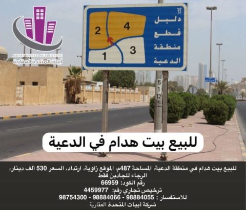 For sale: A traditional house in the Daiya area, with an area of 487 square meters, corner location, setback. Price: 530,000 Kuwaiti dinars. For serious inquiries only. Code number: 66959. Commercial license number: 4459977. For inquiries - United Abiyat Real Estate Company.