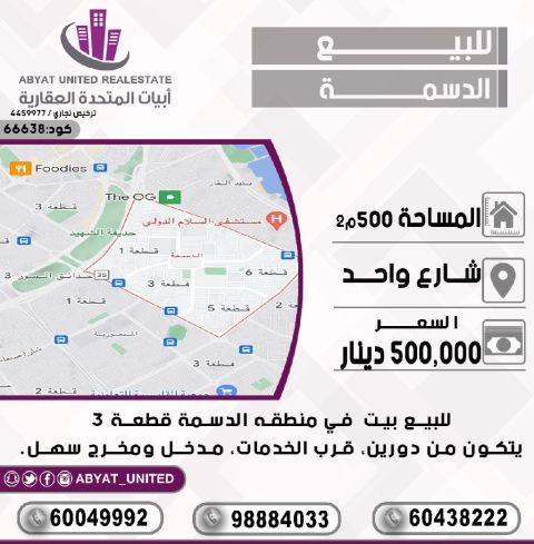 For sale: A house in the Dasma area, Plot 3. Location: One street. Area: 500 square meters. It consists of two floors, near services, with easy access. For inquiries, Mobile 1, Mobile 2, Mobile 3. Price: 500,000 dinars. Code: 66638.