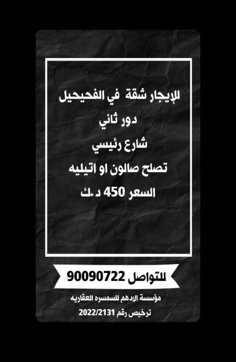 Brand new 5-bedroom floor (villa) for rent in Fahaheel. This might be one of the best locations in Fahaheel. It is a safe, secure, and quiet villa. If you are single, a couple, a family, etc., looking for a nice place to stay with a wonderful location, this is the place for you. It has 5 bedrooms, 4 bathrooms, a living room, a maid's room, a kitchen, and shaded parking. Rent is KD650 per month. Please call Anwar.