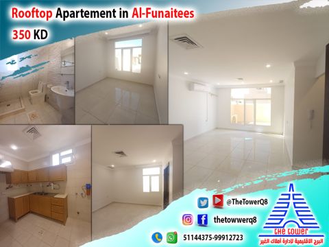 For rent in Fintas, an apartment with a private roof from a villa, front and back - super deluxe finishing - 3 bedrooms (including a master bedroom - two rooms share a bathroom) living room - equipped kitchen - two adjacent parking spaces. Rent 350 KD. For inquiries.