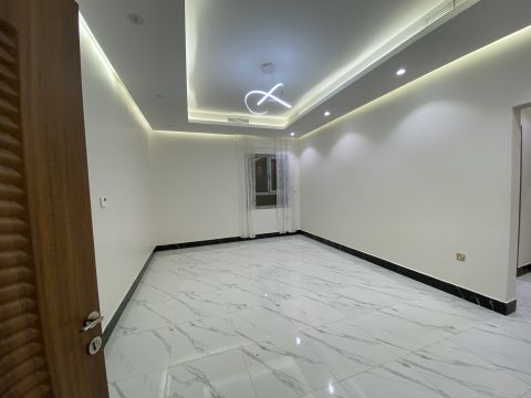 Apartment for rent in Fintas, first floor with elevator, 3 bedrooms including a master bedroom, large living room, equipped kitchen, maid's room with bathroom, deluxe finishing, parking spaces. Rent is 400 dinars.