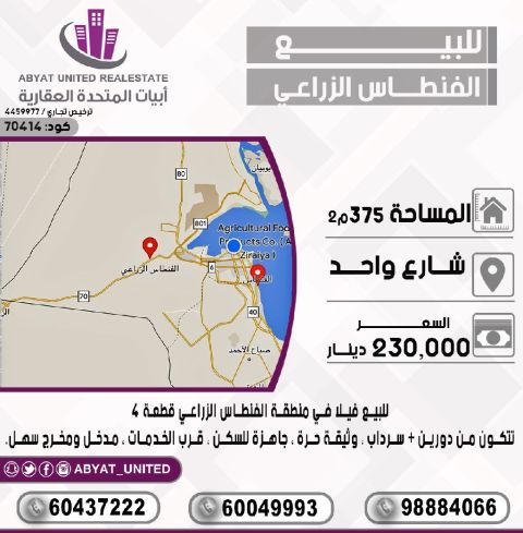 للبيع: فيلا في منطقة الفنطاس الزراعي، قطعة 4، تقع على شارع واحد. المساحة: 375 متر مربع. تتكون من دورين، سرداب، وثيقة حرة، جاهزة للسكن، قرب الخدمات، مدخل ومخرج سهل. للاستفسار، النقال رقم 1، النقال رقم 2، النقال رقم 3. السعر: 230 ألف دينار. الكود: 70414.