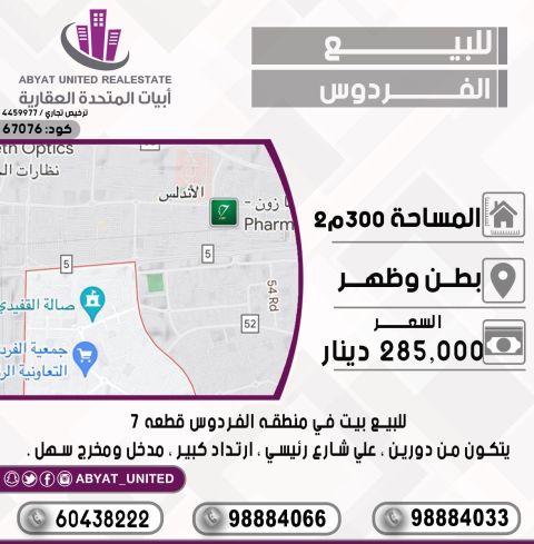 For sale: A house in the Al-Firdous area, plot 7. The location is spacious front and back. Area: 300 square meters. It consists of two floors, on a main street, with a large setback, and easy access. For inquiries, mobile 1, mobile 2, mobile 3. Price: 285,000 dinars. Code number: 67076.