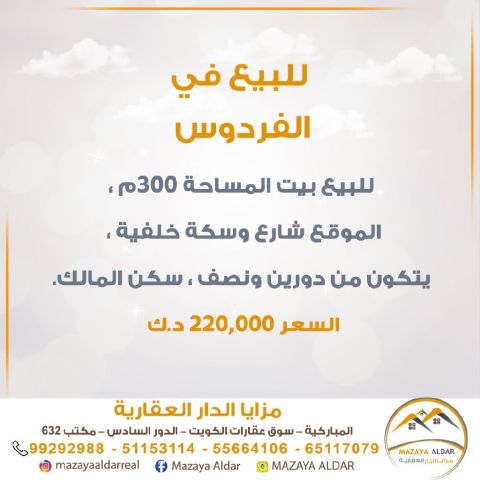 للبيع: بيت في الفردوس بمساحة 300 متر مربع، يقع على شارع واحد، السعر 200,000 دينار كويتي.