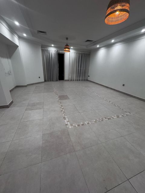 For rent in Jabriya, Block 5, a basement floor with a large private yard, super deluxe finishing, spacious areas and modern design, two parking spaces, a nearby square, close to services, everything is central. The floor consists of 4 bedrooms including 2 master bedrooms, a dressing room, a jacuzzi, a hall, a large private yard, a salon, an external bathroom, a fully equipped modern kitchen, a maid's room with its own bathroom, a storage room, a driver's room with its own bathroom, all totaling 5 bathrooms. The rent is 900 Kuwaiti dinars inclusive of everything.