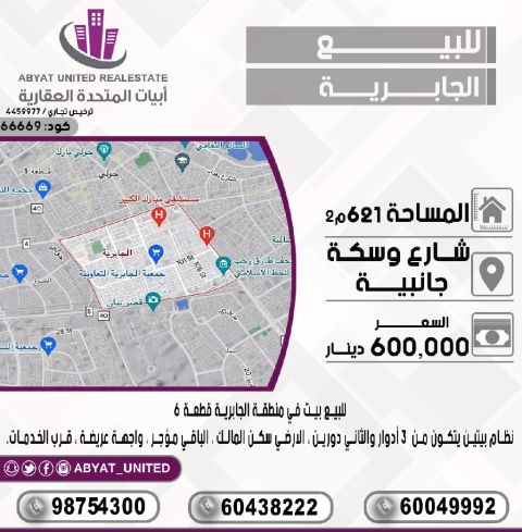 للبيع: بيت في منطقة الجابرية، قطعة 6. الموقع: على شارع وسكة جانبية. المساحة: 612 متر مربع. نظام بيتين يتكون من 3 أدوار والثاني دورين. الأرضي سكن المالك، والباقي مؤجر. واجهة عريضة، وقرب الخدمات. للاستفسار، اتصل على النقال 1، النقال 2، النقال 3. السعر: 600 ألف دينار كويتي. الكود: 66669.
