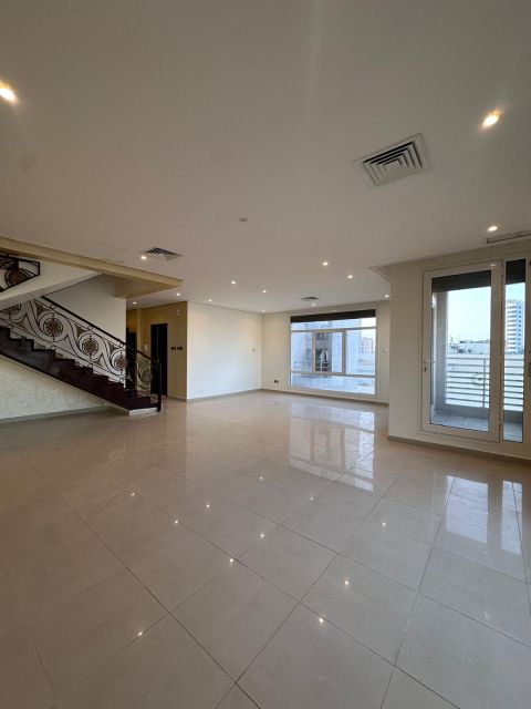 For rent in Jabriya, distinctive duplex apartment with an area of 206 SQM in an upscale location, with 2 private parking spaces in the basement, a reception and spacious living room, kitchen, guest bathroom, external room for the driver, upper floor with 3 bedrooms, 2 bathrooms, maid's room with bathroom, laundry room, swimming pool, health club, outdoor children'playground, beautiful