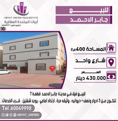للبيع: فيلا في منطقة جابر الأحمد، قطعة 7، بمساحة 400 متر مربع. تقع على شارع واحد، تتكون من 3.5 أدوار، ديوانية، وثيقة حرة، ارتداد أمامي، تحتوي على شقتين، وقريبة من الخدمات. للاستفسار، اتصل بالجوال 1. السعر: 430,000 دينار كويتي، كود 10.