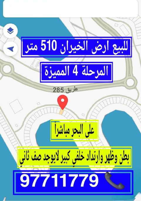 For sale: Al-Khiran Marine land, 510 square meters (Distinguished Phase 4), first row on the sea with a large rear setback, no second row. For inquiries, list your property with us.