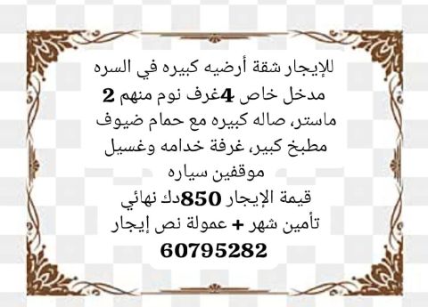 للإيجار: شقة أرضية في السرة مع مدخل خاص - 4 غرف نوم منها 2 ماستر، صالة كبيرة مع حمام ضيوف، مطبخ كبير، غرفة عامل منزلي وغسيل، موقفين متجاورين - الإيجار الشهري 850 دينار نهائي غير قابل للتفاوض - تأمين شهر + عمولة نصف إيجار.
