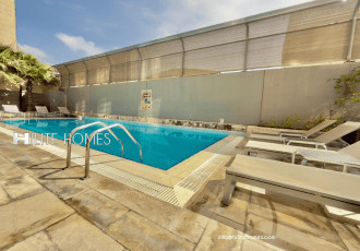 A semi furnished apartment with a direct sea view for rent in Bneid Al Qar. It's 150 SQM and consists of a master bedroom, two bathrooms, a fully equipped kitchen, a lounge, a terrace, a gym, a swimming pool, a lobby, paddle, football, and basketball courts, 24 - hour security cameras, a children'playground, a barbecue area, pet area, and two designated parking spaces in the basement. Includes