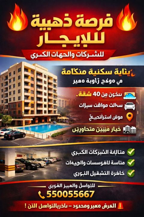 For rent in the Bneid Al-Qar area, two buildings next to each other in a prime location with easy front and rear access, easy entry and exit, and spacious car parking. New construction, first occupant, and super deluxe finishing. Each building has 40 apartments, totaling 80 apartments in both buildings. The apartments have two bedrooms, a living room, two bathrooms, a kitchen, and a basement with car parking and a swimming pool. Rent is 385 dinars. Rental is sought for companies, ministries, and schools.