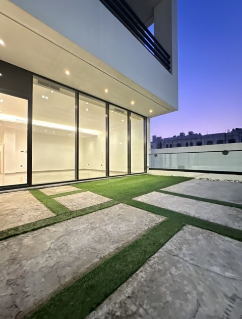 For rent: Ground floor with private entrance, modern finishing, 5 master bedrooms, large living room, guest bathroom, fully equipped kitchen, maid's room with bathroom, laundry room, driver's room, 3 parking spaces. Rent: 1100 Kuwaiti dinars.