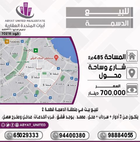للبيع: بيت في منطقة الدسمة، قطعة 2. الموقع: شارع وساحة محول. المساحة: 485 متر مربع. يتكون من 3 أدوار، سرداب، محل، مصعد. يوجد شقق. قرب الخدمات. مدخل ومخرج سهل. للاستفسار: النقال رقم 1، النقال رقم 2، النقال رقم 3. السعر: 700 ألف دينار. الكود: 70218.