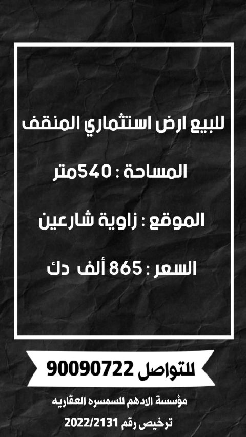 For sale, an investment land in Al-Mangaf, area 540 square meters, located at the corner of two streets, price 865 thousand Kuwaiti Dinars.