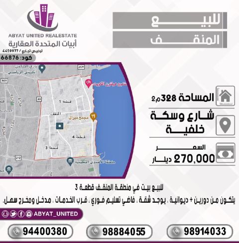 For sale: A house in the Al-Mangaf area, Plot 3. Location: Street with a back alley. Area: 328 square meters. It consists of two floors, a diwaniya (reception area), and includes an apartment. Vacant and ready for immediate delivery. Close to services, with easy access and exit. For inquiries: Mobile 1, Mobile 2, Mobile 3. Price: 270,000 Kuwaiti dinars. Code: 66876.