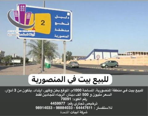 For sale: A house in Al-Mansouriya area, with an area of 1000 square meters, located in a prime location with front and back access, featuring setbacks. It consists of 3 floors. The price is 1,500,000 dinars. Serious inquiries only. Code number: 70091. Commercial license number: 4459977. For inquiries - United Abiyat Real Estate Company.