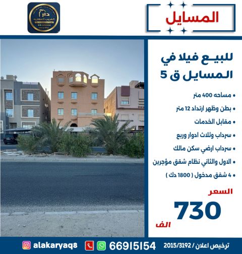 للبيع فيلا في المسايل ق5 مساحة 400 متر مربع، موقع على شارع واحد، مكونة من 3 أدوار وربع وسرداب، سكن المالك، بناء 2015، السعر 500 ألف دينار كويتي، ترخيص رقم 3192 / 2015
