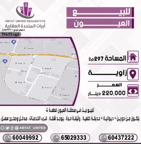 للبيع: بيت في منطقة العيون، قطعة 4، موقع زاوية، مساحة 297 متر مربع، يتكون من دورين، ديوانية، حديقة خلفية، وثيقة حرة، يحتوي على شقة، قرب الخدمات، مدخل ومخرج سهل. للاستفسار، النقال رقم 1، النقال رقم 2، النقال رقم 3. السعر: 220 ألف دينار. الكود: 70433.