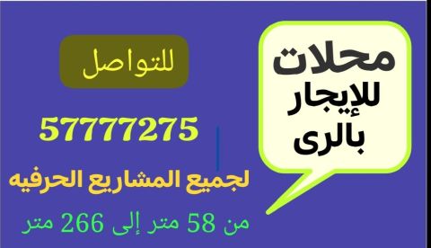 للإيجار: محل في الري، مساحة 75 متر مربع، إيجار 1200 دينار كويتي؛ محل، مساحة 65 متر مربع، إيجار 1050 دينار كويتي؛ يصلح لجميع الأنشطة الصناعية.