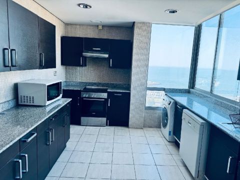 Apartment for rent in Salmiya, full floor, direct sea view, consisting of 3 master rooms + maid’s room with its bathroom, guest bathroom, 5 bathrooms, hall, kitchen, pool available, cameras, lobby, security, gym, parking, available furnished and unfurnished, for rent including electricity, water, maintenance, rent starting from KD1000 + insurance + commission