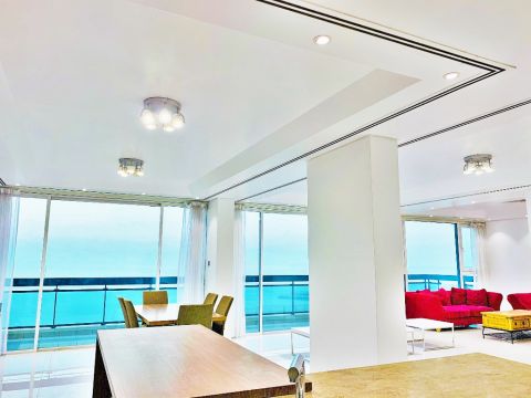 Luxurious 3 - bedroom penthouse for rent in the best location in Salmiya. It has a large living room with a big balcony and a fully equipped open kitchen, three large master bedrooms, a maid's room, and a very large terrace. It offers a breathtaking panoramic sea view, a great location with amenities, easy access to Gulf Road, and includes two basement parking spots. Strictly for expats only. rent