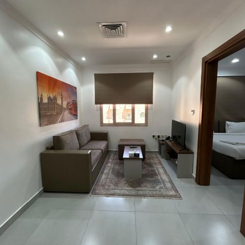 Furnished apartment for rent in East Block 3, private location with sea view, super deluxe finishing, consisting of a living room, bedroom, kitchen, bathroom, surveillance cameras, security, swimming pool, gym, lobby, billiards, table tennis, internet, parking, cleaning service, including water, electricity, and maintenance. rent starts at KD600 + one month's security deposit + company commission