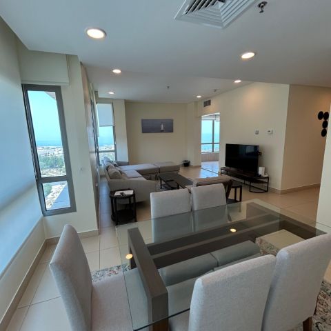 Furnished apartment for rent in Salmiya, Block 9. Private location with sea views, excellent finishing, consisting of a living room, kitchen, 2 bedrooms, 2 bathrooms, surveillance cameras, security, swimming pool, gym, lobby, billiards, table tennis, internet, cleaning service, parking, including water, electricity, and maintenance. rent starts at 850 dinars + one month's security deposit + company