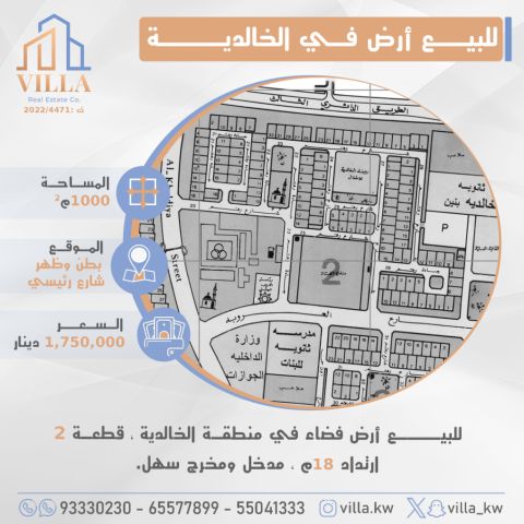 للبيع أرض فضاء في منطقة الخالدية، قطعة 2، المساحة 1000 متر مربع، الموقع بطن وظهر، شارع رئيسي، ارتداد 18 متر، مدخل ومخرج سهل. السعر 1,750,000 دينار كويتي. للاستفسار، اتصل على نقال 1، نقال 2، نقال 3.