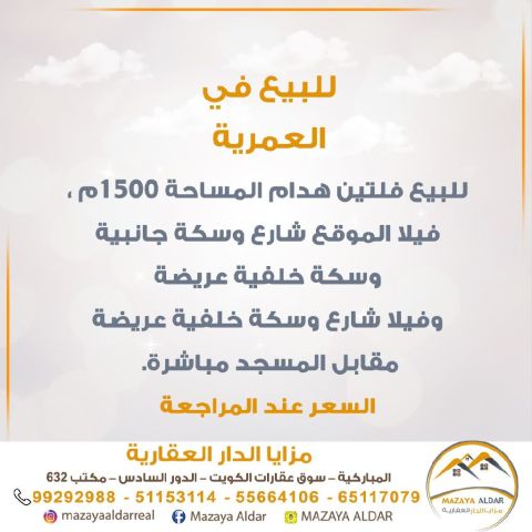 For sale: Two villas for demolition in the Al Amiriya area. The land area is 1500 square meters. The location features a street, a side alley, and a wide back alley. The villa is situated on a street with a wide back alley, directly opposite the mosque. For serious buyers only, no brokers. The price is available upon inquiry. For inquiries, contact the mobile number.