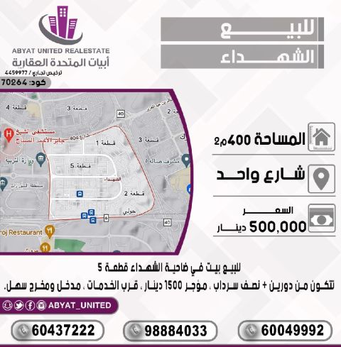 For sale: A house in Al-Shuhada suburb, plot 5. Location: Street one. Area: 400 square meters. It consists of two floors, a half basement, rented for 1500 dinars, easy entrance and exit, near services. For inquiries: Mobile number 1, Mobile number 2, Mobile number 3. Price: 500 thousand dinars. Code: 70264.
