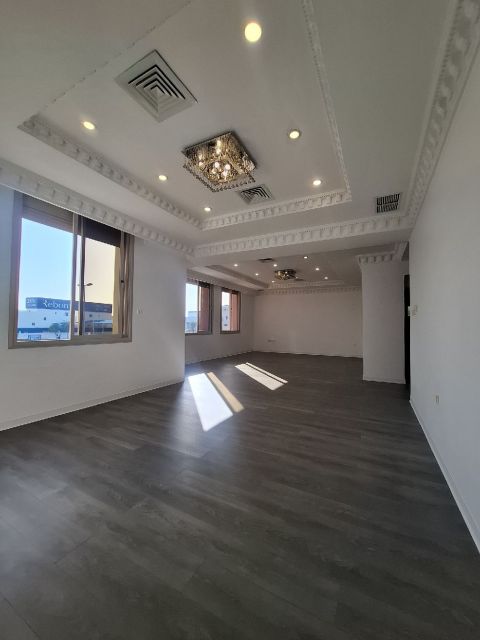 For rent: A floor in Al-Sadeeq with a very prime location on a main street, easy entrance and exit from King Faisal Road (50). First floor with elevator, super deluxe finishing, large spaces. 4 bedrooms including two master bedrooms and two bedrooms sharing a bathroom, large living room with laundry area, guest bathroom, large equipped kitchen, maid's room, 5 bathrooms, central air conditioning, central satellite system, central boiler and filter, electric shutters, parquet flooring, 4 shaded parking spaces (two at the back, two at the front). Rent: 950 dinars.