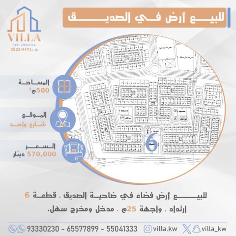 للبيع أرض فضاء في ضاحية الصديق، قطعة 6، المساحة 500 متر مربع، الموقع على شارع واحد، ارتداد، واجهة 25 متر، مدخل ومخرج سهل. السعر 570,000 دينار كويتي. للاستفسار، نقال 1، نقال 2، نقال 3.