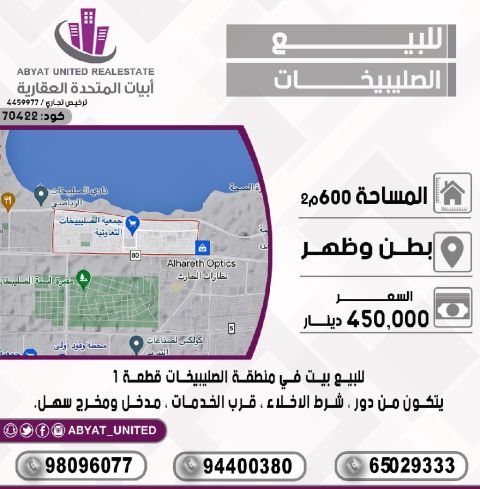 For sale: a house in the Al-Sulaibikhat area, Plot 1. The location is central and accessible. The area is 600 square meters, consisting of one floor. Condition: vacant possession. Close to services, with easy entry and exit. For inquiries, mobile numbers: 1, 2, 3. Price: 450,000 Kuwaiti dinars. Code: 70422.