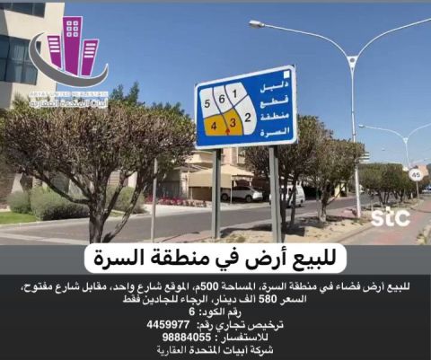 For sale: vacant land in Al-Surra area, area 500m, location on a single street, opposite an open street, price 580 thousand dinars, for serious buyers only, code number 6, commercial license number 4459977, for inquiries contact United Abiat Real Estate Company.